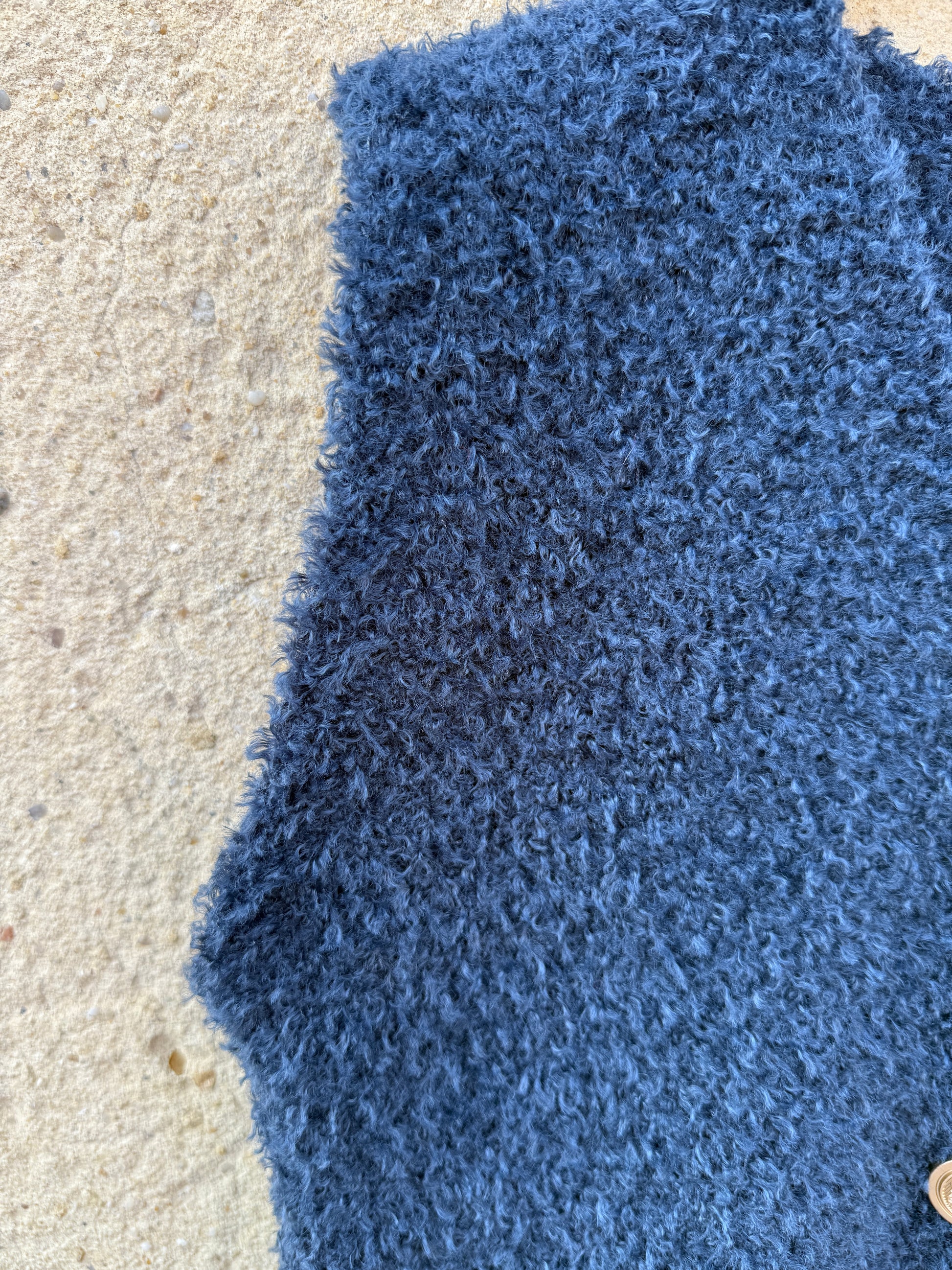 Ce gilet en maille, fabriqué en Italie, se distingue par une coupe légèrement ample qui apporte confort et élégance. Sa composition inclut 20 % de mohair, apportant une douceur exceptionnelle, tandis que les fibres complémentaires ont été choisies pour permettre un lavage en machine à 30°C, sans altérer la forme ni la texture.